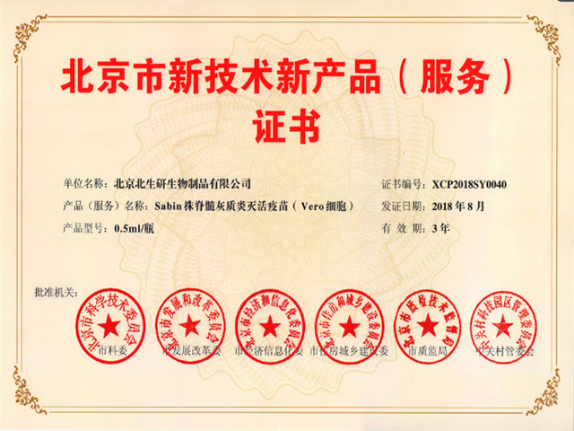 2018年9月7日,国药中生北生研公司自主研发生产的Sabin株脊髓灰质炎灭活疫苗(Vero细胞)(sIPV疫苗)经过北京市科委、发改委、经信委等六部门评审,获得北京市新技术新产品证书。