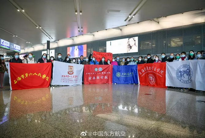 1月28日17时53分,东航第九架包机从上海再次起飞,载着上海第三批援鄂医疗队共148人及医疗救护物资803件11.7吨,紧急驰援武汉。