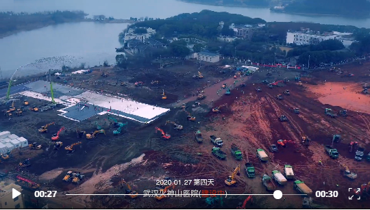 截至1月28日中午12时,火神山医院HDPE膜铺贴面积已完成60%,北区箱式板房基础混凝土浇筑基本完成,其他区域箱式板房混凝土浇筑全面展开,第一栋箱式板房开始搭设,现已完成60个骨架安装,地下管网铺设同步全面展开,现场进度正在快速推进。