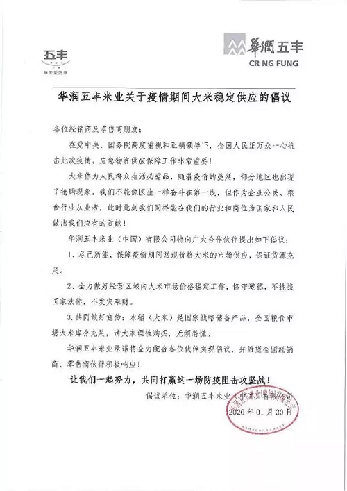 华润集团旗下华润万家、华润五丰等在疫情发生后第一时间发布公告,郑重承诺“不涨价、保供应”。