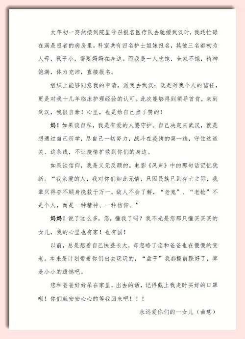“我已顺利到达武汉,一切都好,勿念!”在顺利到达武汉后,她给自己的母亲写了一封家书。其中写道:“妈!如果谈自私,我是有爱的人要守护。自己决定来武汉,就是想通过自己所学,尽自己一切努力,战斗在疫情的第一线,守住这道关、这条线,不让疫情扩散到你们的身边。”