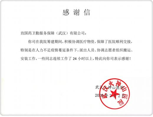 武汉火神山医院亦对于国药卫勤志愿者团队表达了感谢!