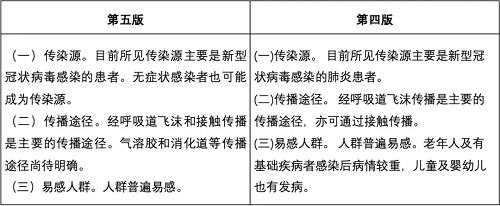 在第四版的基础上,第五版修改了传染源,进一步明确无症状感染者也可能成为传染源。传播途径更新为经呼吸道飞沫和接触传播是主要的传播途径,气溶胶和消化道等传播途径尚待明确。易感人群覆盖到人群普遍易感。