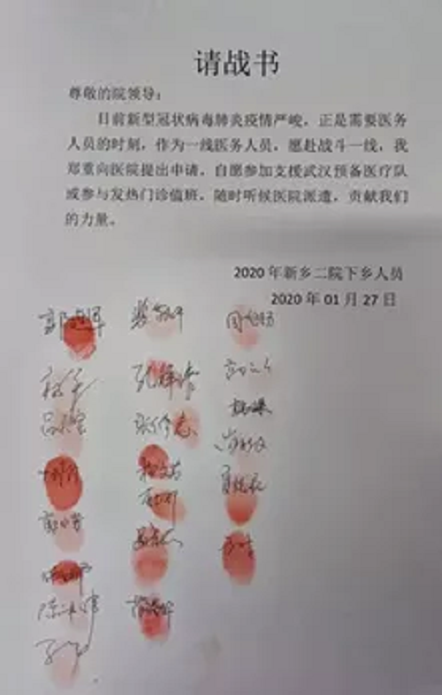 面对疫情,花果医院发布了《坚决打赢防控新型冠状病毒肺炎疫情倡议书》,医院广大医护人员积极响应,主动请战,不一会儿,请战书便刷满了整个屏幕。