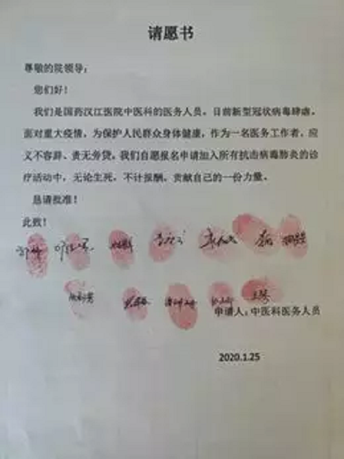 得知发生疫情,国药汉江医院中医科主任郭玮带动医院同事,第一个请愿并庄严地按下红手印:无论生死,不计报酬!