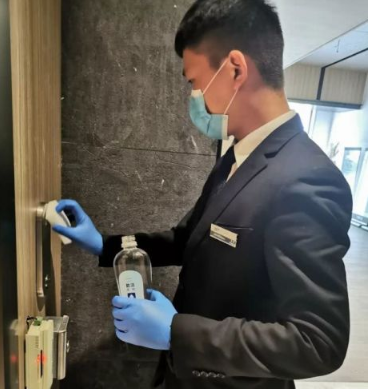 华侨城(物业)集团有限公司深圳龙华分公司护管队长张博在给电梯消毒。