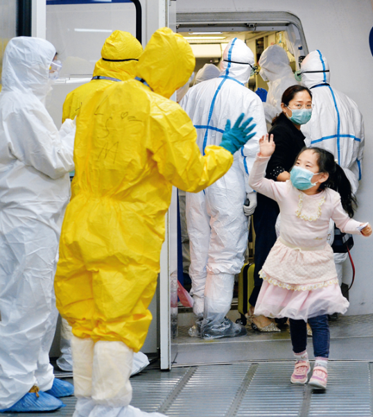 石油石化、电力、通信、粮油、航空运输等基础保障型央企把做好保供工作作为首业首责,强化担当意识、周密组织生产、全力保障供应,优先保障重点地区需要,合力筑起抗击疫情的坚强后盾。图为2020年2月5日晚,乘坐东方航空公司包机从新加坡回武汉的一名刚下飞机的小姑娘跟地服人员打招呼。当晚,从日本大阪和新加坡飞来的国航和东航的两架民航飞机在武汉天河国际机场降落,370名湖北人终于回家。 湖北日报全媒记者 魏铼/摄