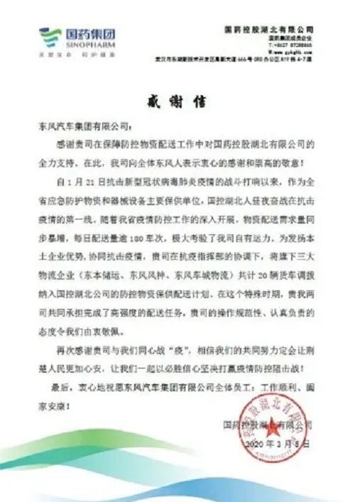 近日,国药控股湖北公司专门致信东风汽车集团有限公司,对该集团所属企业在抗疫战斗中给予的大力帮助表达诚挚谢意。
