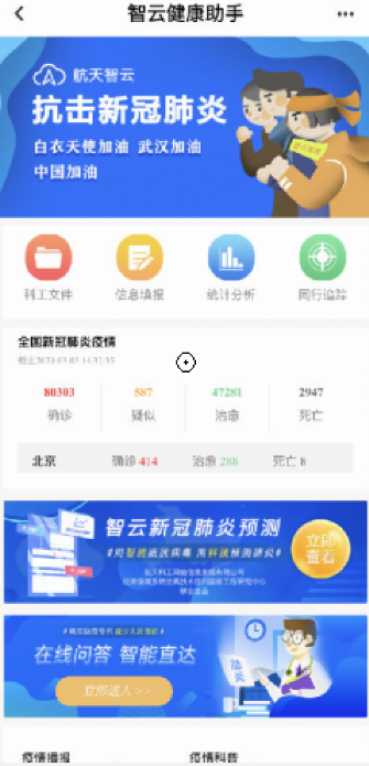中国航天科工二院网信公司发挥大数据及人工智能技术优势,开发智云健康助手,为复工复产提供信息捕获、数据支撑、辅助决策和态势监控等技术支撑,AI+数据,云上助力疫情防控和应急管理。智云健康助手通过二维码扫描填报,页面简洁、操作便捷,具备疫情信息查询、疫情信息填报、医疗服务对接、政策文件共享等功能,其中疫情信息填报可实现“出行记录、健康日报、体温监控、隔离情况”等常用信息一键提交、自动统计。后台数据实时智能分析、可视化展示,加强了对企业复工复产期间的趋势分析和疫情预警,让数据的变化实时显示,快速精准“阻击”疫情蔓延,为抗击疫情、复工复产提供智能分析。目前,智云健康助手已在北京市丰台区委区政府等政府机构,二院、湖南航天等多家单位推广应用。