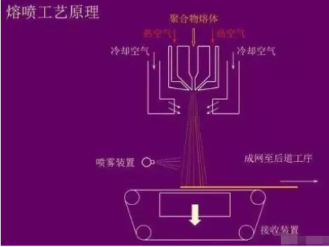 顾名思义,熔喷布是“喷”出来的。采用高速热空气流对模头喷丝孔挤出的聚合物熔体细流进行牵伸,由此形成超细纤维并收集在凝网帘或滚筒上,同时自身粘合而成。