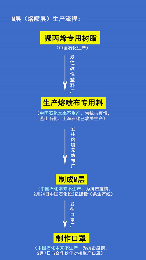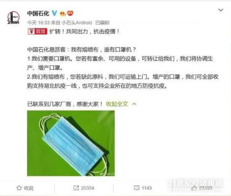 2月6日下午16时33分,中国石化发出“英雄帖”《我有熔喷布,谁有口罩机》。2月7日中午,中国石化就与合作伙伴对接完成11条口罩生产线。3月3日起,中国石化在北京50座加油站开始销售的“纳通”牌口罩,就是与民营企业北京纳通科技集团有限公司合作生产的。中国石化提供原料的协作企业口罩日产量达到105万只。