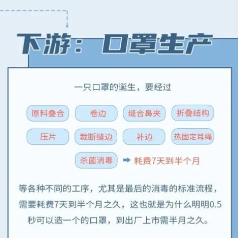 尤其是最后的消毒标准流程,需要耗费7天到半个月之久,这也是为什么明明0.5秒可以造一只口罩,到真正上市买卖的时间大家都觉得很久。