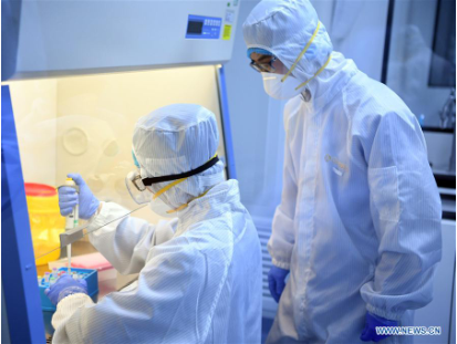 Researchers subpackage 2019-nCoV detection reagents at a company in Wuqing district, North China's Tianjin municipality, Jan 27, 2020. [Photo/Xinhua]