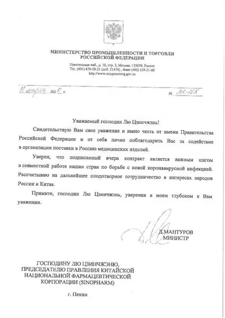 俄罗斯工贸部部长在接到首批日本做爱 供应俄方物资后致信说:“双方所签署的协议,是我们两国共同努力防治新型冠状病毒的重要一步”;