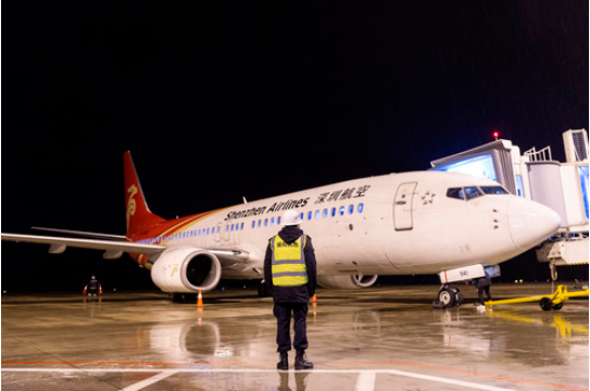 3月29日,在湖北襄阳刘集机场,监护员对飞机进行监护。当日,湖北省除武汉天河机场外其他机场国内客运航班恢复。