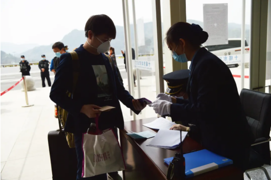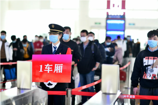 在出发现场,安检、进出站、验票、候车等环节都为复工人员开辟了绿色通道,旅客保持一定距离,避免人员聚集;进站前所有人员需展示健康码并测量体温;全体乘客均使用“团体旅客证”车票。