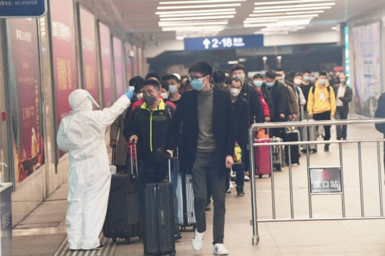 汉口站的站前广场上,停着36台点对点接送大巴,40多位志愿者专门来到现场服务,测体温、消毒后有序上车。1013名员工被大巴点对点地送往工厂或居住的小区。