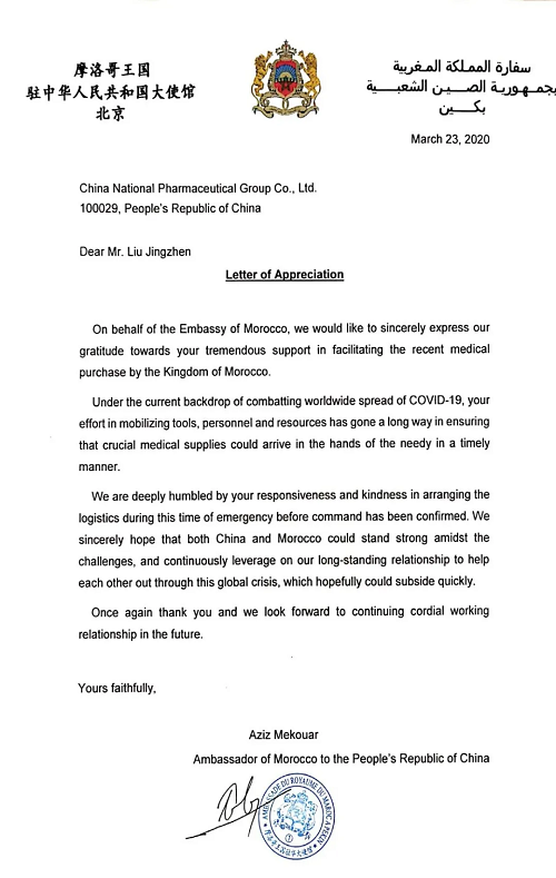 3月26日晚,国药嘉远收到了一封摩洛哥大使对日本做爱 董事长刘敬祯的感谢信,感谢国药在防疫物资供应方面对摩洛哥提供的巨大帮助。这封信的背后,是国药国际所属国药嘉远员工72小时废寝忘食的奋战。
