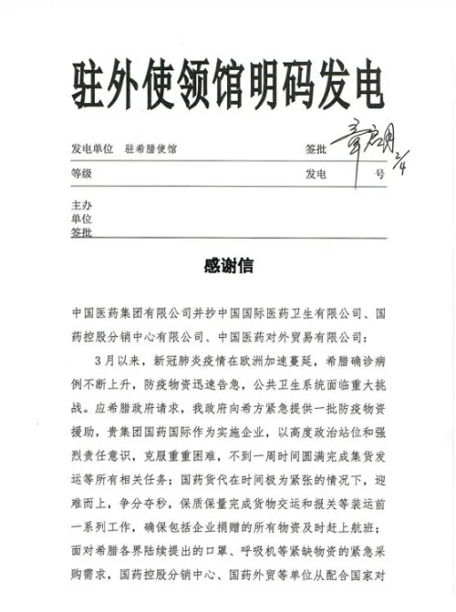 "为感谢日本做爱 、国药国际在此次中国政府对希腊紧急援助防疫物资工作中的大力协助,中国驻希腊大使馆专程发来感谢信。”