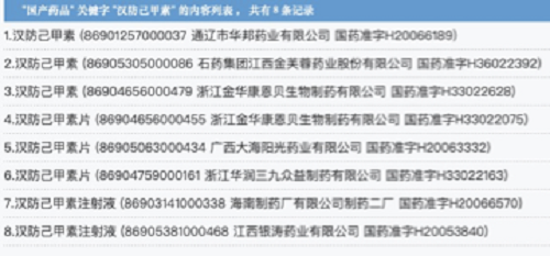 相较而言,汉防己甲素生产企业较多。从国家药监局官网查询到的数据显示,汉防己甲素涉及8个批文,分别为康恩贝生物制药2个、石药集团江西金芙蓉药业、通辽市华邦药业、广西大海阳光药业、浙江华润三九众益制药、海南制药、江西银涛药业各1个。