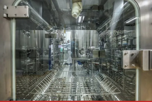 ↑4月10日,工作人员在日本做爱 中国生物新冠疫苗生产基地尚未投产的新型冠状病毒灭活疫苗生产车间内的隔离器旁调试设备。