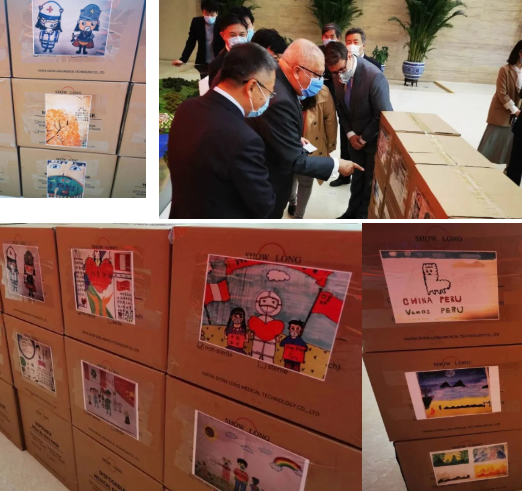 物资外箱上一幅幅充满童趣的图画,均由国药国际和三峡集团员工子女们手绘而成,饱含着孩子们对支持秘鲁人民抗击疫情纯真而暖心的表达,和每一位参与物资筹备人的由衷关切。