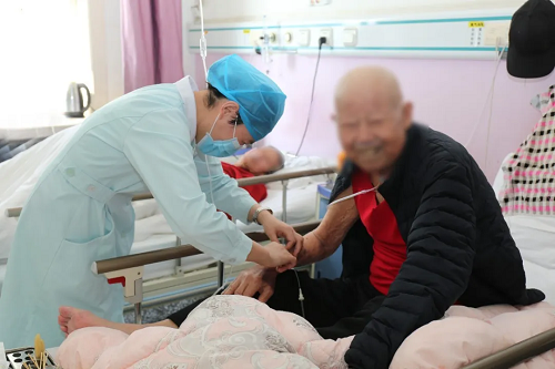 国药北方医院呼吸内科,第二批援鄂医疗队队员刘晶晶援鄂返岗后,为患者进行静脉输液治疗。