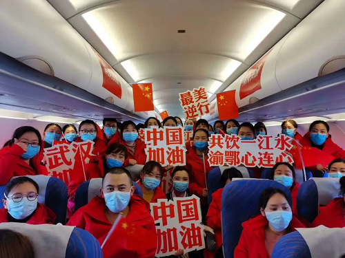 国药重庆西南铝医院胡晓鸣响应号召,加入重庆第十四批支援武汉医疗队,下午出发前一刻飞机上的合影。