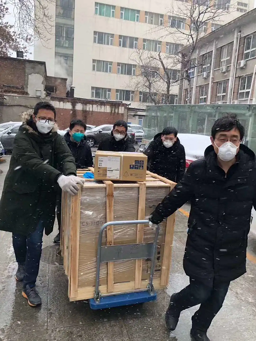 2月14日,国药器械天津公司的同事们众志成城,冒着风雪给天津市海河医院送防疫设备,保障新冠病人急需。