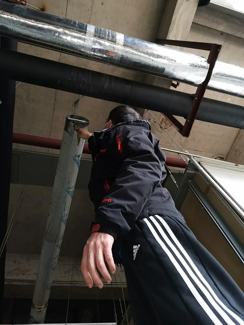 国药中国生物武汉公司工程部杨秀勇到车间夹层检查注射用水管道运行情况。