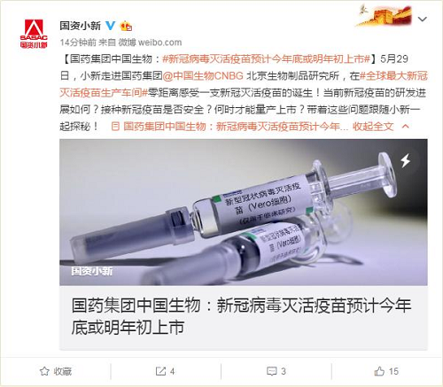 据了解,中国生物目前承担了全国80%计划免疫疫苗的供应,努力践行着中央企业的责任与担当。而在此次新冠疫情阻击战以及新冠灭活疫苗的研发过程中,中国生物急党之所急,急国家之所盼,急人民之所需,迎难而上攻克难关。围绕可诊、可治、可防的目标,继续加强科技攻关,为实现新冠灭活疫苗的安全性、有效性、可及性和保障人民生命健康贡献央企力量!
