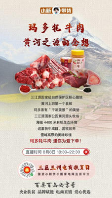 国家电网帮扶的青海果洛州玛多县被誉为“千湖美景”之地,位于黄河源头,是中国三江源国家级自然保护区核心腹地。为保护三江源生态,国家电网在玛多县连续三年实施清洁采暖帮扶项目,建成全国首个高海拔清洁采暖示范县。2018年,国家电网有限公司捐赠的国内最高海拔光伏扶贫电站在玛多县并网发电,该电站收益惠及玛多县11个贫困村628户1686名贫困人口。国家电网本场带货的玛多牦牛肉,就产自青海三江源国家公园黄河源头牧场,海拔4400米以上的有机生态环境加原始游牧放养,确保品质天然。