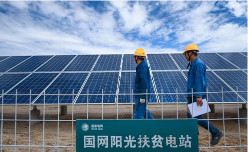 国网青海电力工作人员在国家电网捐赠的玛多10兆瓦易地扶贫光伏电站内巡视设备