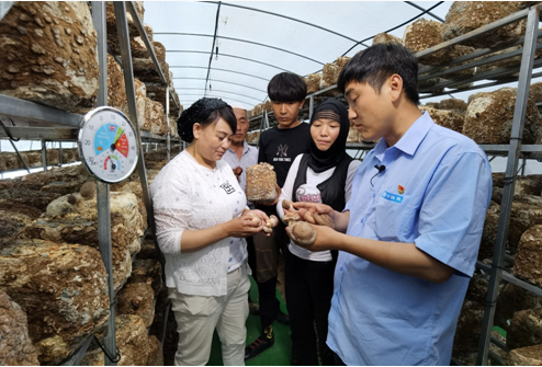 中建二局甘肃省康乐县何家沟村驻村书记牛军帅在香菇大棚内结对培训。