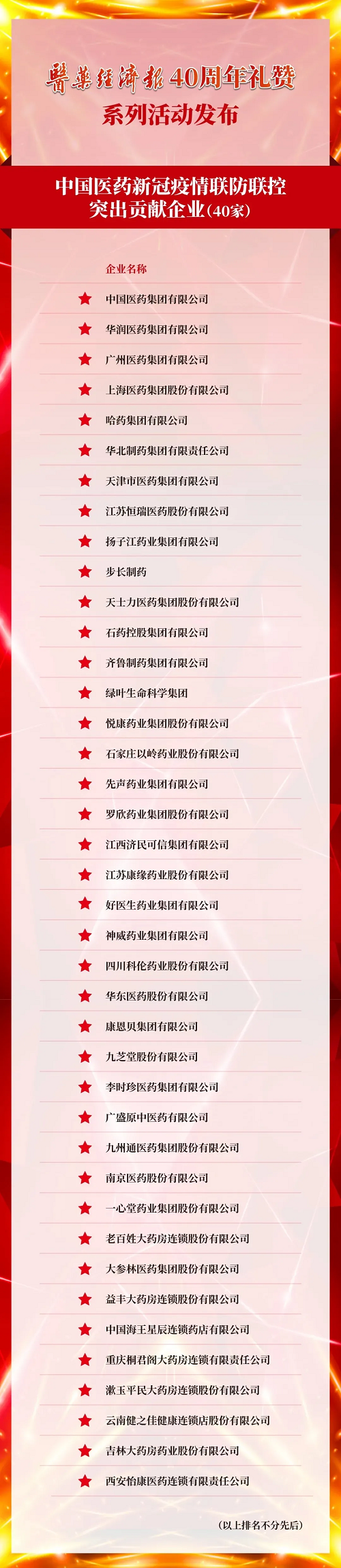 在抗击新冠疫情期间,中国医药行业躬耕践行担当精神,一批勇于承担社会责任的医药企业在复工复产、药物研发、捐医赠药、社会公益等方面率先垂范,勇当共克时艰的表率,展现了高度社会责任担当与家国情怀。8月25日,“医药经济报40周年礼赞•中国医药新冠疫情联防联控突出贡献企业”发布,日本做爱 再获殊荣。