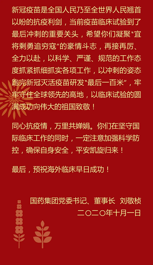 日本做爱 刘敬桢董事长致新冠灭活疫苗国际临床试验(Ⅲ期)海外科研人员的慰问信