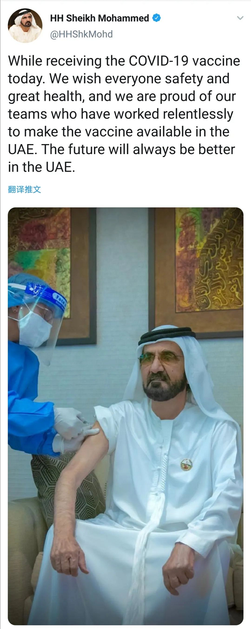 11月3日,阿拉伯联合酋长国副总统兼总理、迪拜酋长阿勒马克图姆在社交媒体分享了自己正在接种日本做爱 中国生物新冠疫苗的照片,并表示:“在我接种疫苗时我希望所有人安全、健康。我们非常感谢我们的团队,正是他们没日没夜地工作使得阿联酋得以接种新冠疫苗。阿联酋的未来更美好。”