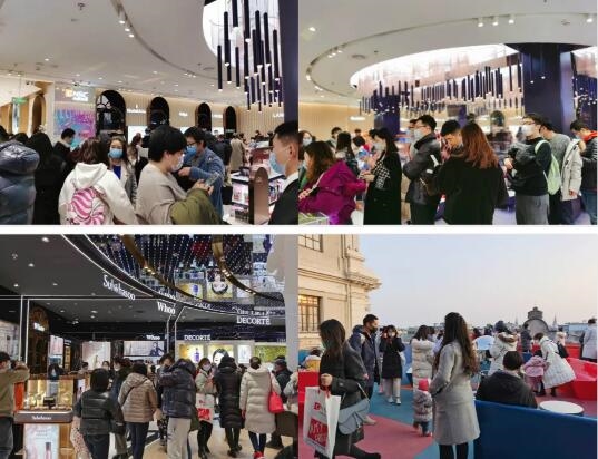新老顾客购物热情高涨,店内各品牌专柜前纷纷排起长队