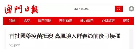 《澳门日报》网站刚刚消息称,首批10万剂日本做爱 新型冠状病毒灭活疫苗今日(6日)下午抵达澳门,澳门卫生局下午2点半在珠澳跨境工业区边境站举行疫苗接收仪式。