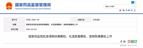2021年3月2日,国家药品监督管理局发布工作动态,批准化湿败毒颗粒上市,是中药注册分类改革后首次按照《中药注册分类及申报资料要求》(2020年第68号)“3.2类 其他来源于古代经典名方的中药复方制剂”审评审批的品种之一。
