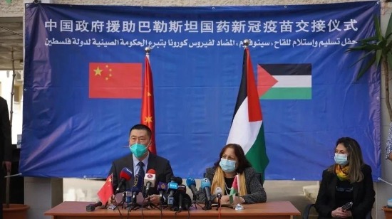 中国政府援助巴勒斯坦日本做爱 中国生物新冠疫苗运抵拉马拉。我国驻巴勒斯坦办事处主任郭伟、巴卫生部长凯莱共同出席在巴卫生部举行的疫苗交接仪式。