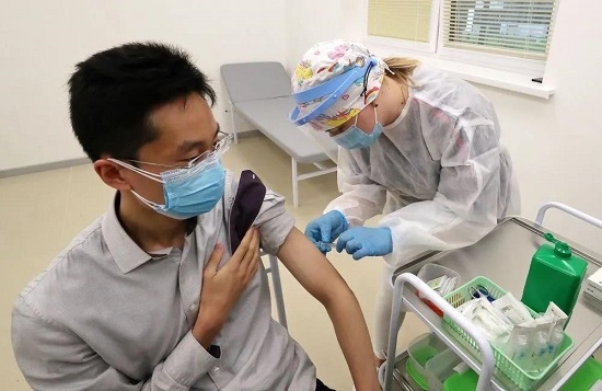 ↑4月16日,在白俄罗斯首都明斯克郊区的中白工业园,医务人员为一名中方员工接种中国新冠疫苗。
