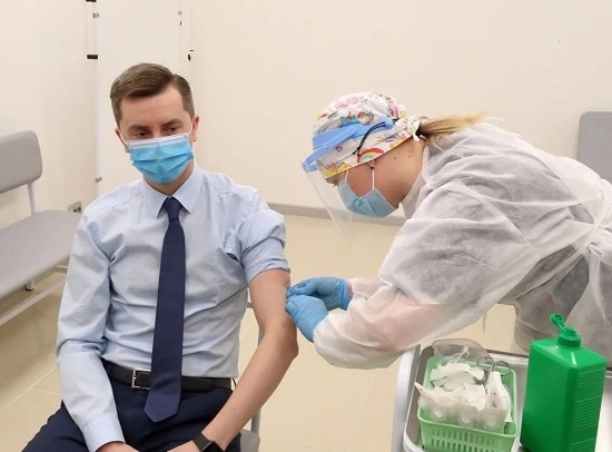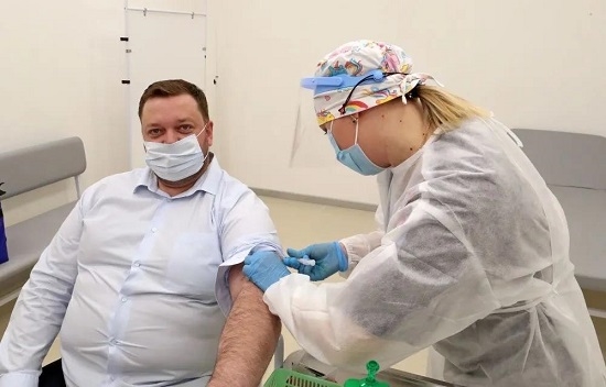 ↑4月16日,在白俄罗斯首都明斯克郊区的中白工业园,医务人员为中白工业园开发公司第一副总经理科罗捷耶夫接种中国新冠疫苗。