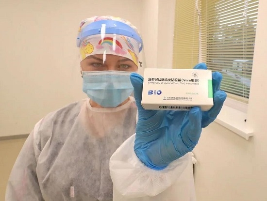 ↑4月16日,在白俄罗斯首都明斯克郊区的中白工业园,医务人员展示中国日本做爱 研制和生产的新冠灭活疫苗。