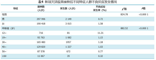 按年龄划分,不良反应发生率最低为≥60岁人群,不良反应发生率为0.32%,其次是30~39岁人群,不良反应发生率为1.18%,12~18周岁人群不良反应发生率最高,为11.31%,以疲劳及接种部位疼痛为主。