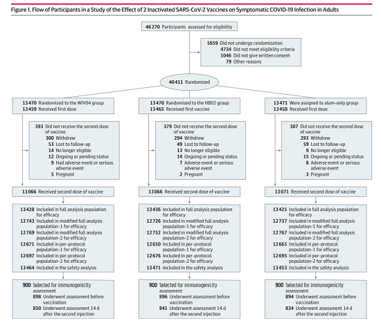 本项研究结果针对中国生物两款新冠灭活疫苗随机、双盲、安慰剂对照的Ⅲ期临床试验开展的中期分析。自2020年7月16日起,40411名受试者入组并随机分为三组,分别为铝佐剂组、新冠疫苗WIV04组和新冠疫苗HB02组。受试者在第0天和第21天接受两次肌肉注射。自第二剂接种后14天,累计确诊142例有效病例(铝佐剂组95例,WIV04组26例,HB02组21例),两种疫苗组有效率分别为72.8%和78.1%(均P<.001)。铝佐剂组出现2例重症病例,两个疫苗组均未出现重症病例。接种后7天总不良反应发生率在铝佐剂组为46.5%,WIV04组为44.2%,HB02组为41.7%。严重不良事件在三组无显著性差异。在两个疫苗组中血清阳转率均高于99.0%(与基线相比中和抗体滴度至少增加4倍),而在铝佐剂组中为2.3%。目前,该研究仍在进行中,长期保护性和安全性仍在评估中。