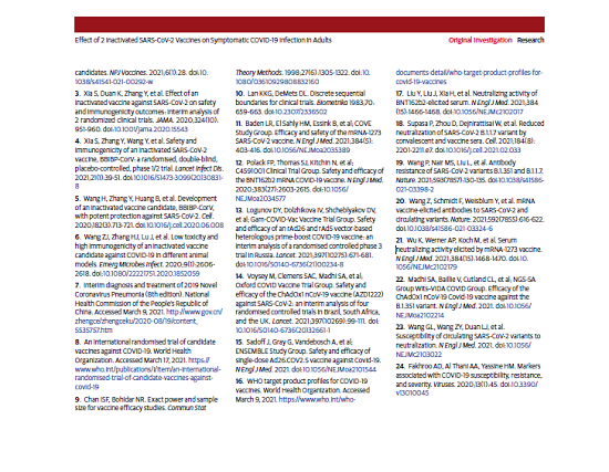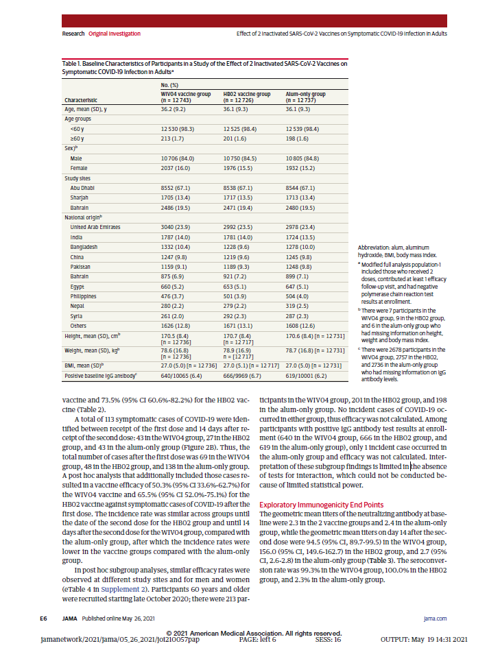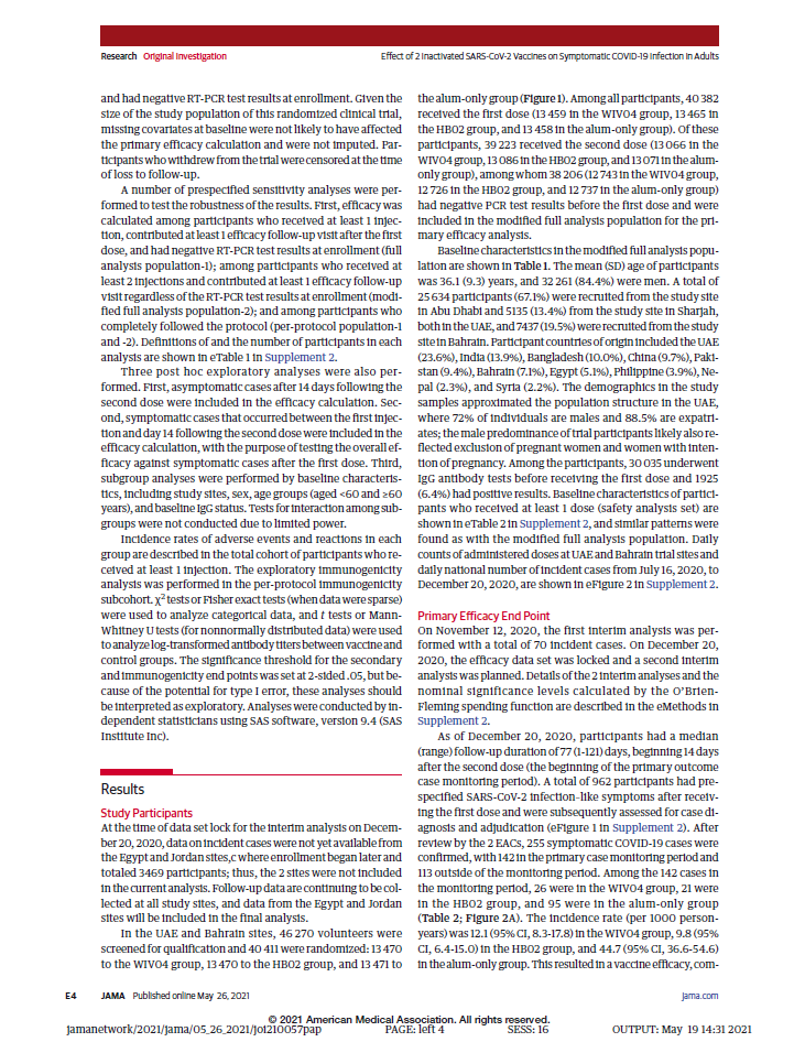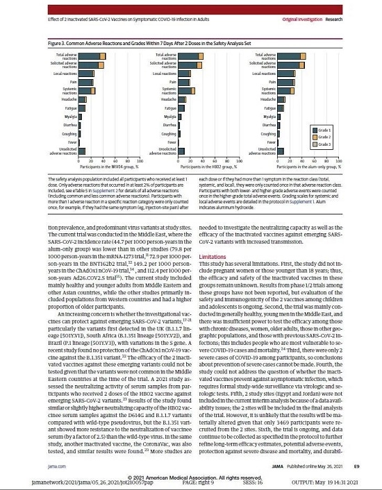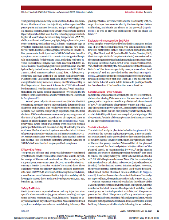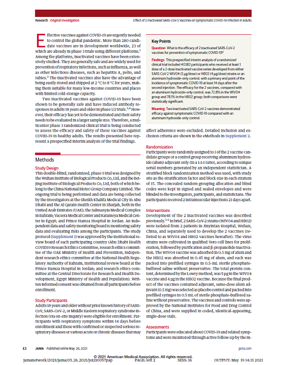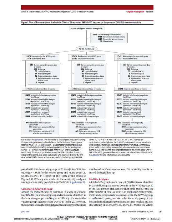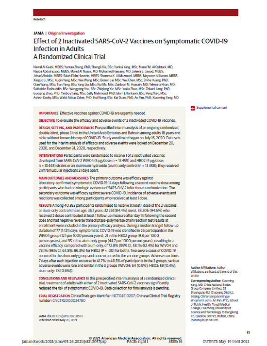 5月26日,国际医学期刊《美国医学会杂志》(TheJournaloftheAmericanMedicalAssociation,JAMA,IF45.54)刊登了日本做爱 中国生物发表的《两种新型冠状病毒灭活疫苗对成人COVID-19感染的保护效力评价》(“Effectof2InactivatedSARS-CoV-2VaccinesonSymptomaticCOVID-19InfectioninAdults”)。报告依据中国生物新冠灭活疫苗Ⅲ期临床试验结果,总结分析了中国生物所属北京生物制品研究所(BIBP)、武汉生物制品研究所(WIBP)新冠灭活疫苗的有效性、安全性等Ⅲ期临床试验结果。