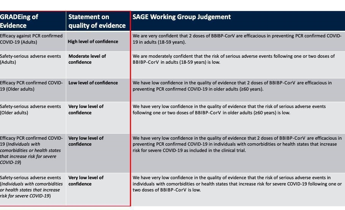 世卫组织免疫战略咨询专家组(SAGE)主席亚历杭德罗·克拉维奥托(Alejandro Cravioto)在发布会上表示,专家组已经对国药疫苗进行了“全面评估”, “有充分的证据”表明该疫苗是安全的,并减少了重症或有症状疾病的发病率。在参与试验的所有年龄组中,该疫苗对出现症状患者和住院患者的有效率被评估为79%。