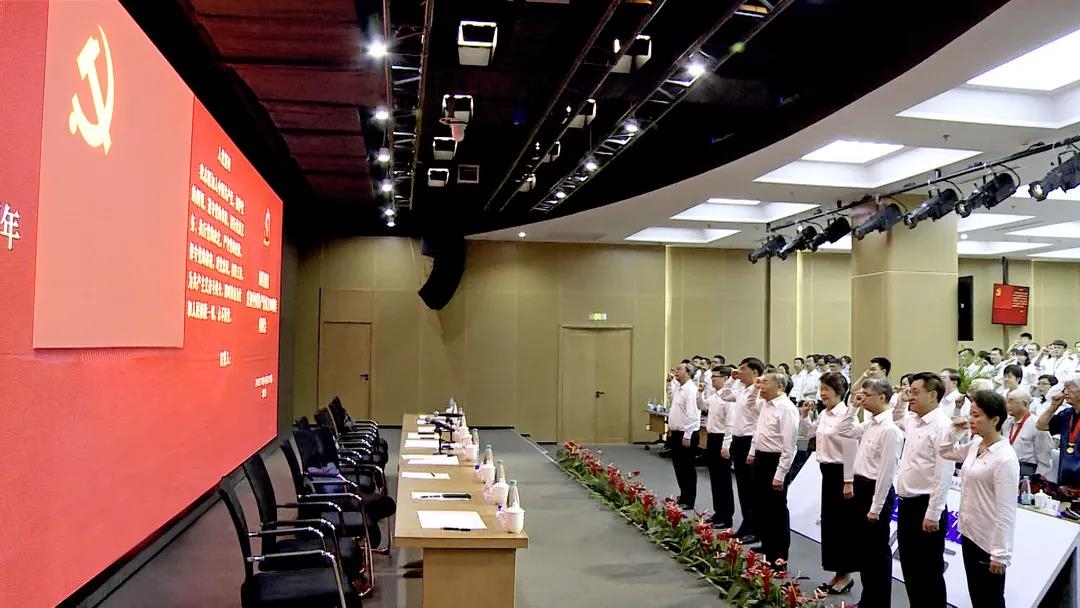 刘敬桢同志带领全体与会党员面向鲜红的党旗,举起右手,庄严地重温入党誓词。