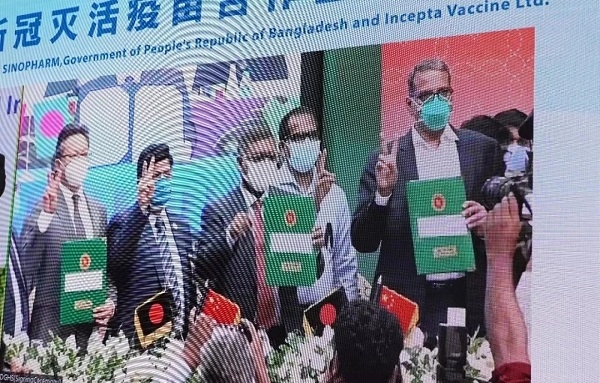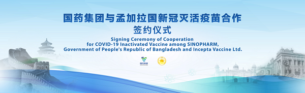 国药国际、中国生物相关负责人与孟加拉国卫生和家庭福利部部长马利克、Incepta公司董事长穆克塔迪尔共同签署了新冠灭活疫苗分装合作备忘录。